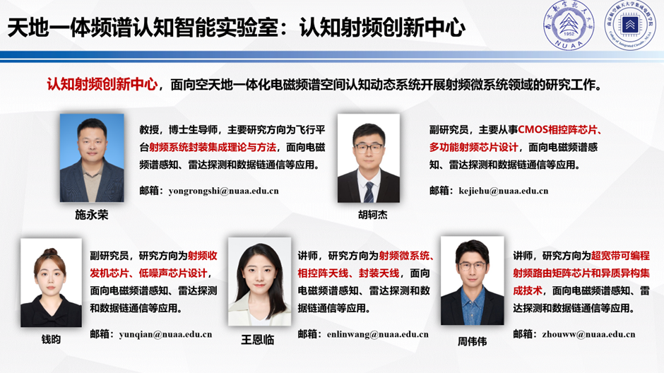 认知射频创新中心面向空天地一体化电磁频谱空间认知动态系统开展射频微系统领域的研究工作。认知射频创新中心目前由20余名研究人员和硕博士学生组成,其中包括施永荣、胡轲杰、钱昀、王恩临、周伟伟。